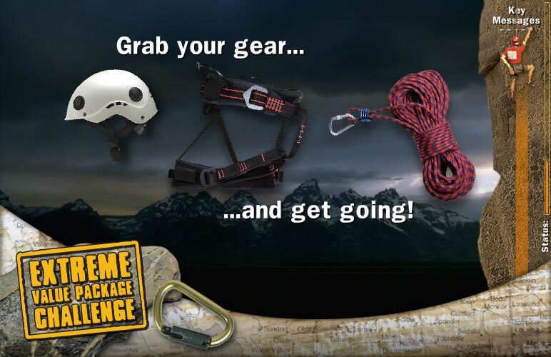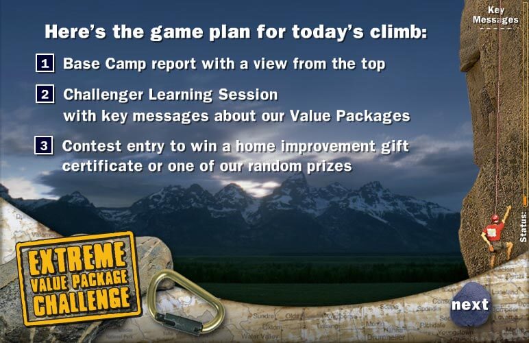 The goal: To train reps with engaging and intreractive exercises to gain stronger retention of information. Employees were encouraged to reach the top of the mountain (i.e. the end of the course) with their climber avatar. The climber avatar (right side) is the progress indicator for both the current module and the course.