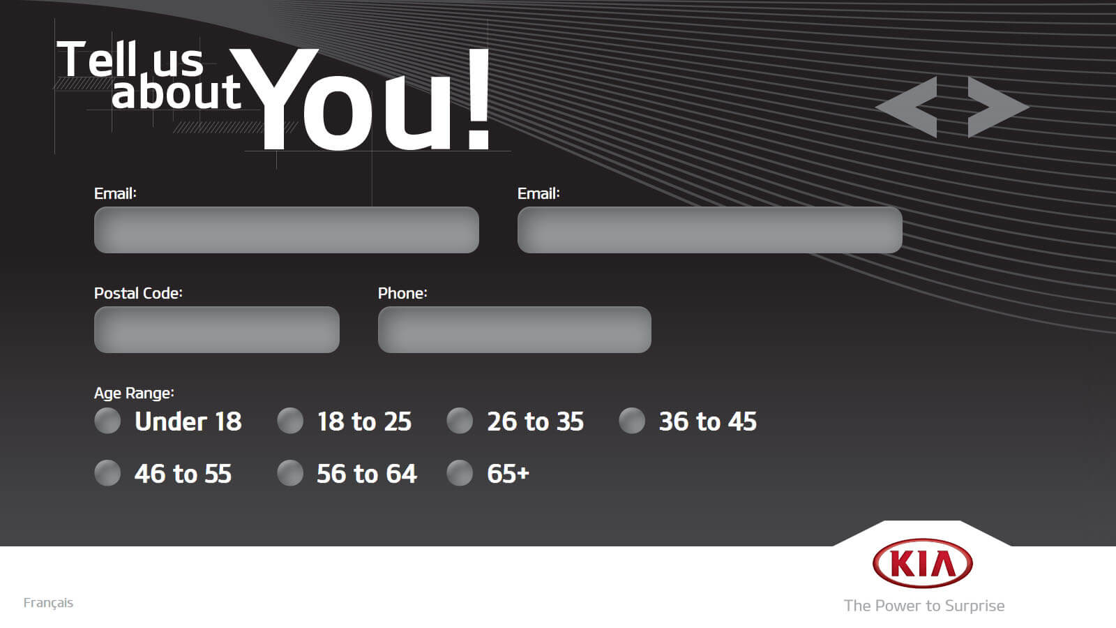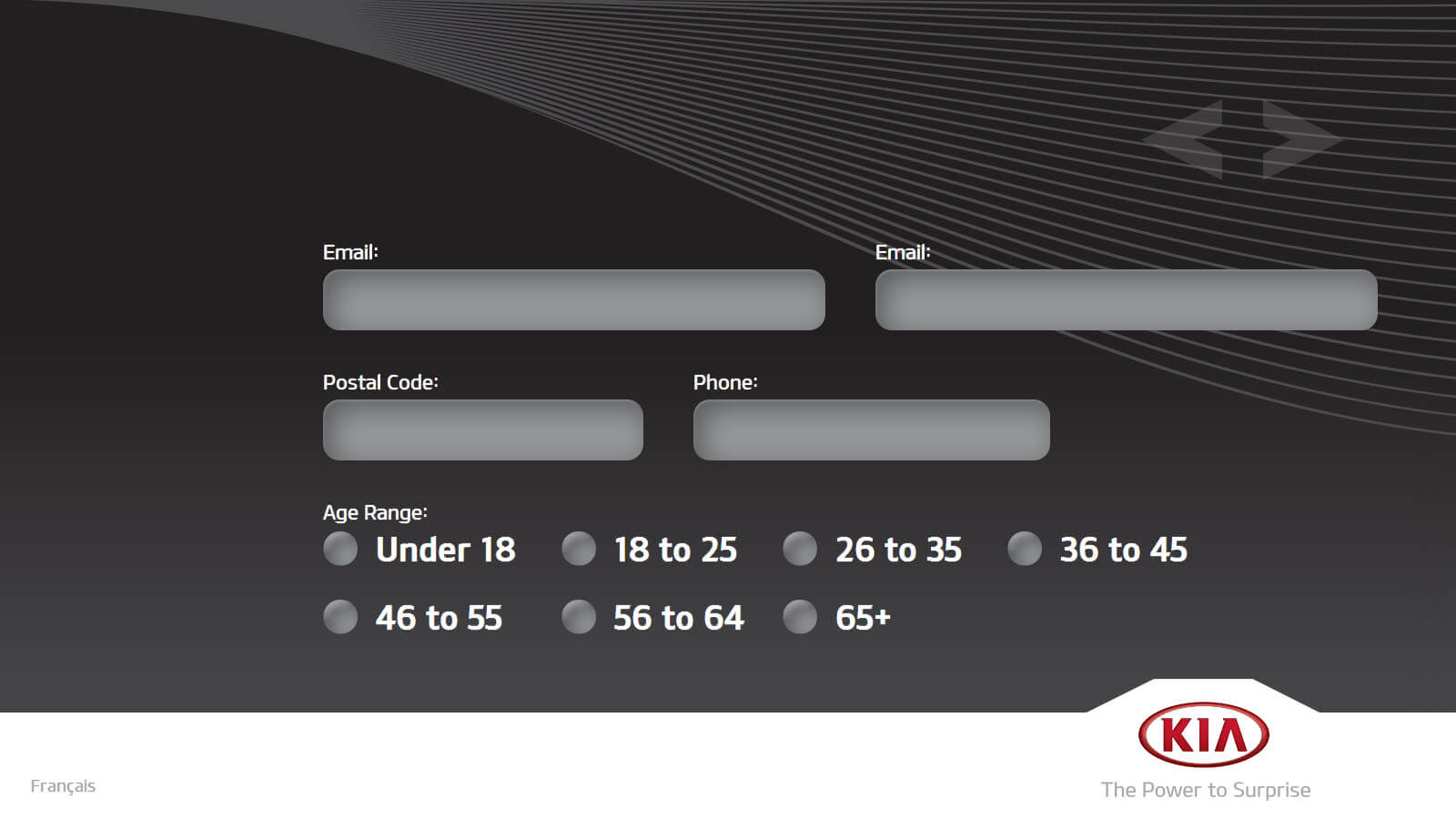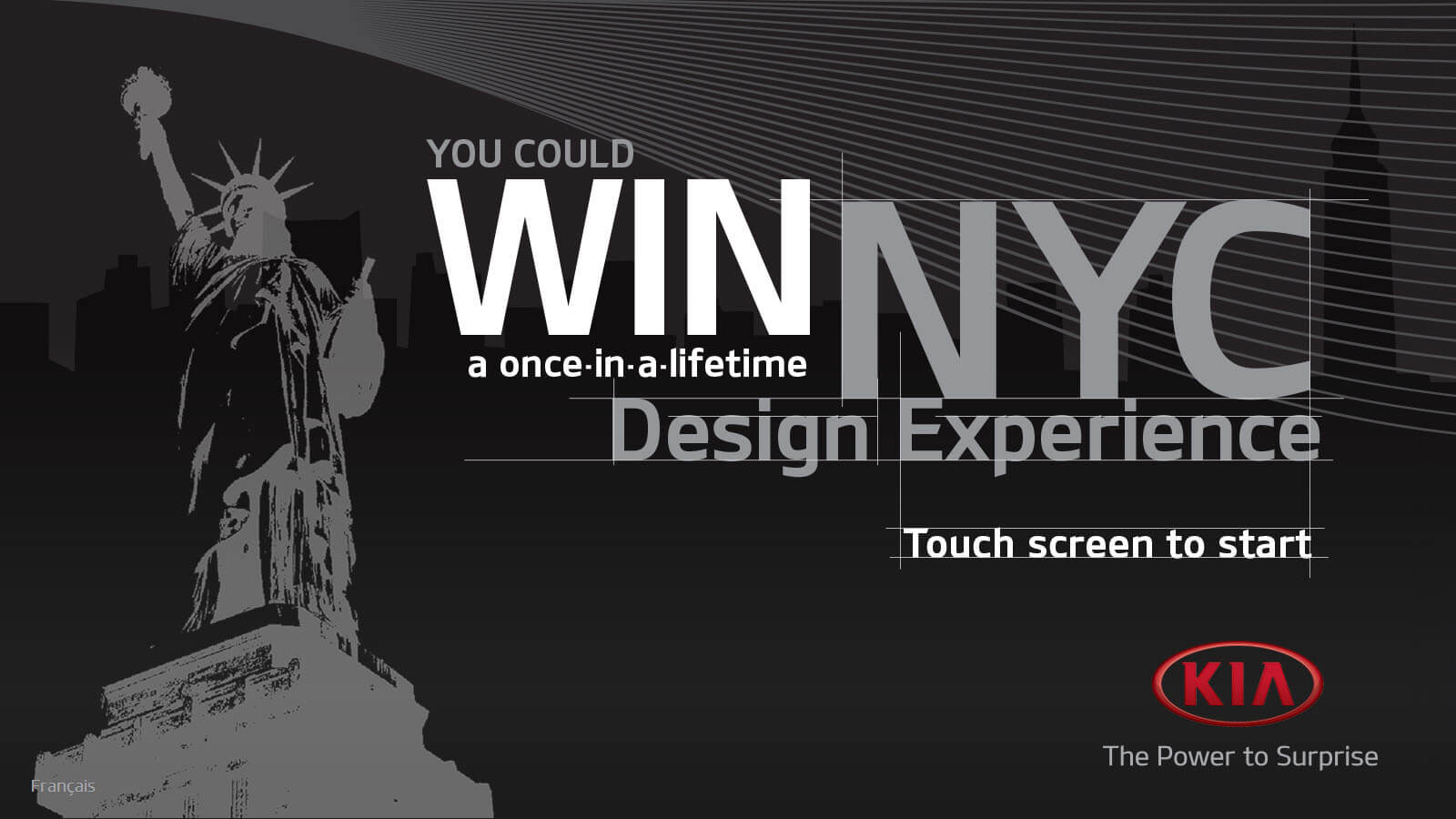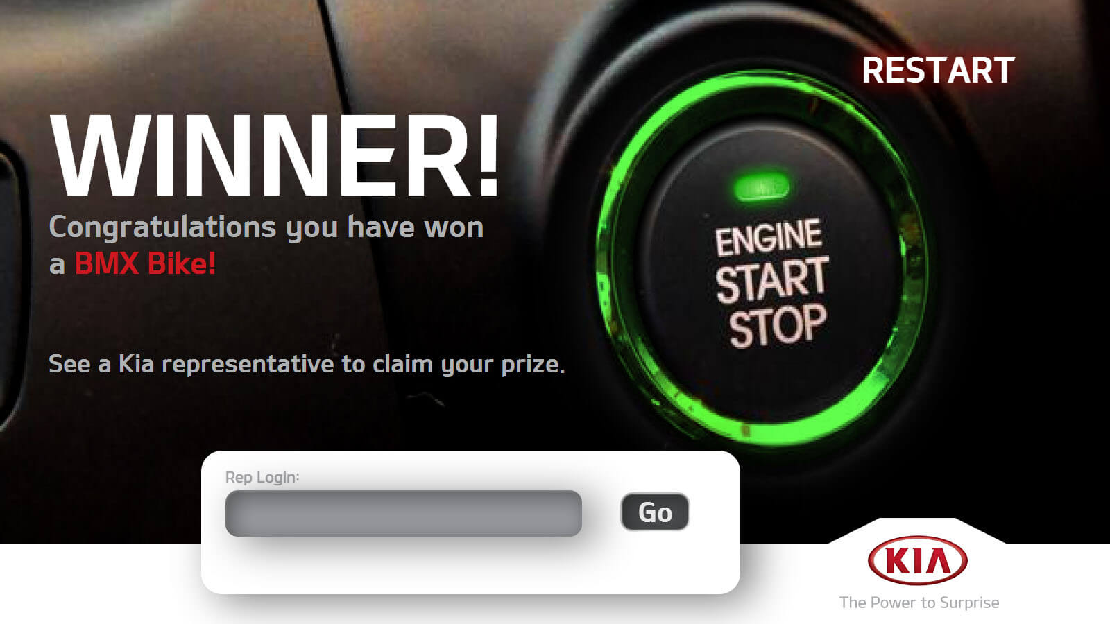 For the International Auto Show, Kia held a fun contest for Auto Show fans. The grand prize: a once-in-a-lifetime design experience in New York City. There were also 100's of instant prizes to be won. This kiosk guided users through a data capture sequence and then run an instant-prizing contest draw.