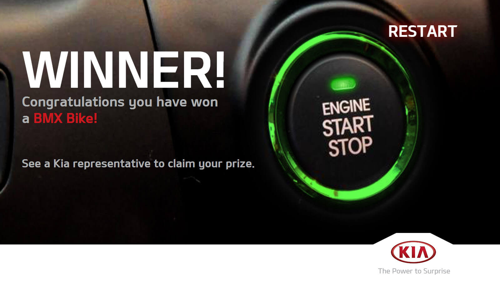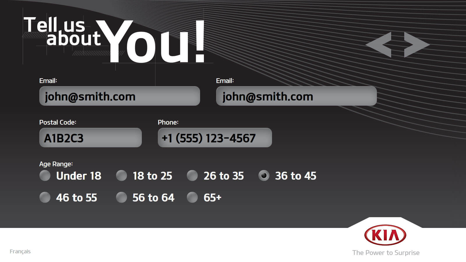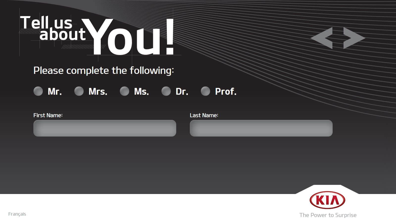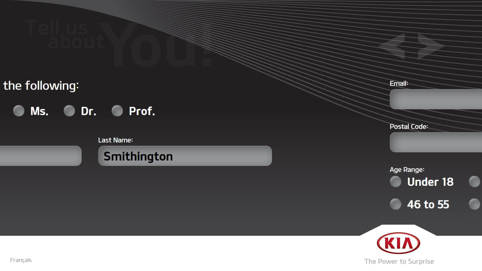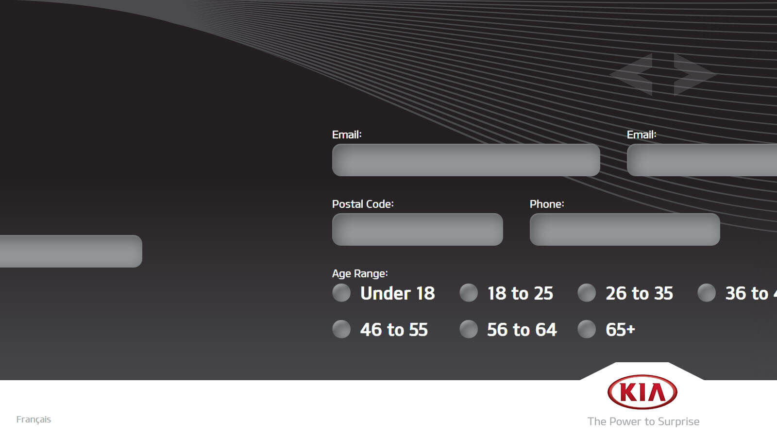 For the International Auto Show, Kia held a fun contest for Auto Show fans. The grand prize: a once-in-a-lifetime design experience in New York City. There were also 100's of instant prizes to be won. This kiosk guided users through a data capture sequence and then run an instant-prizing contest draw.