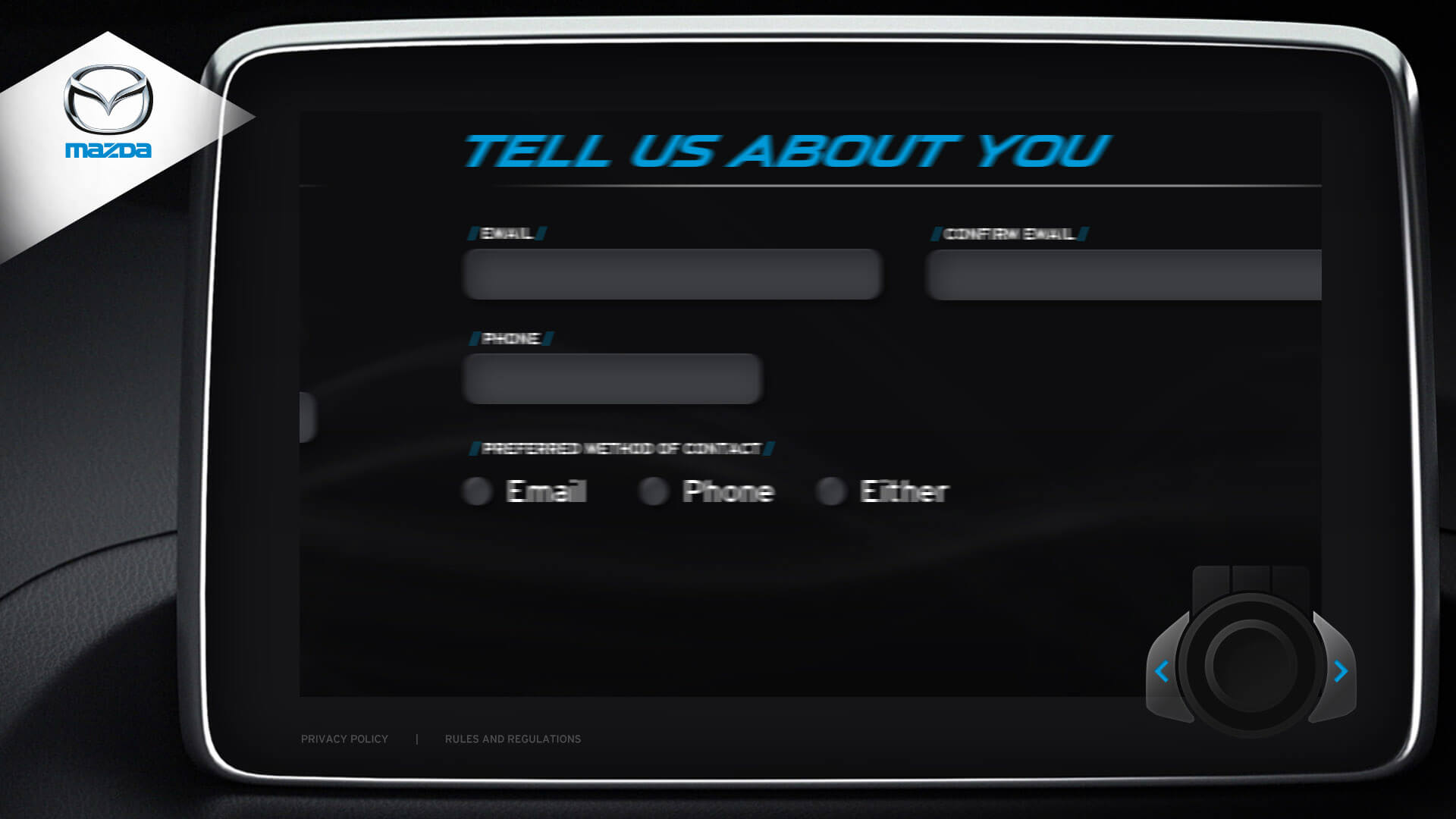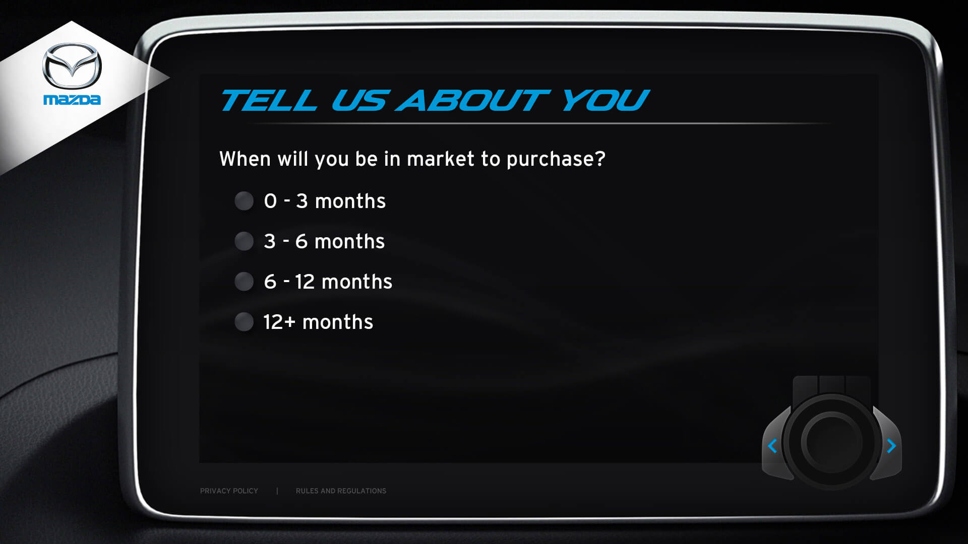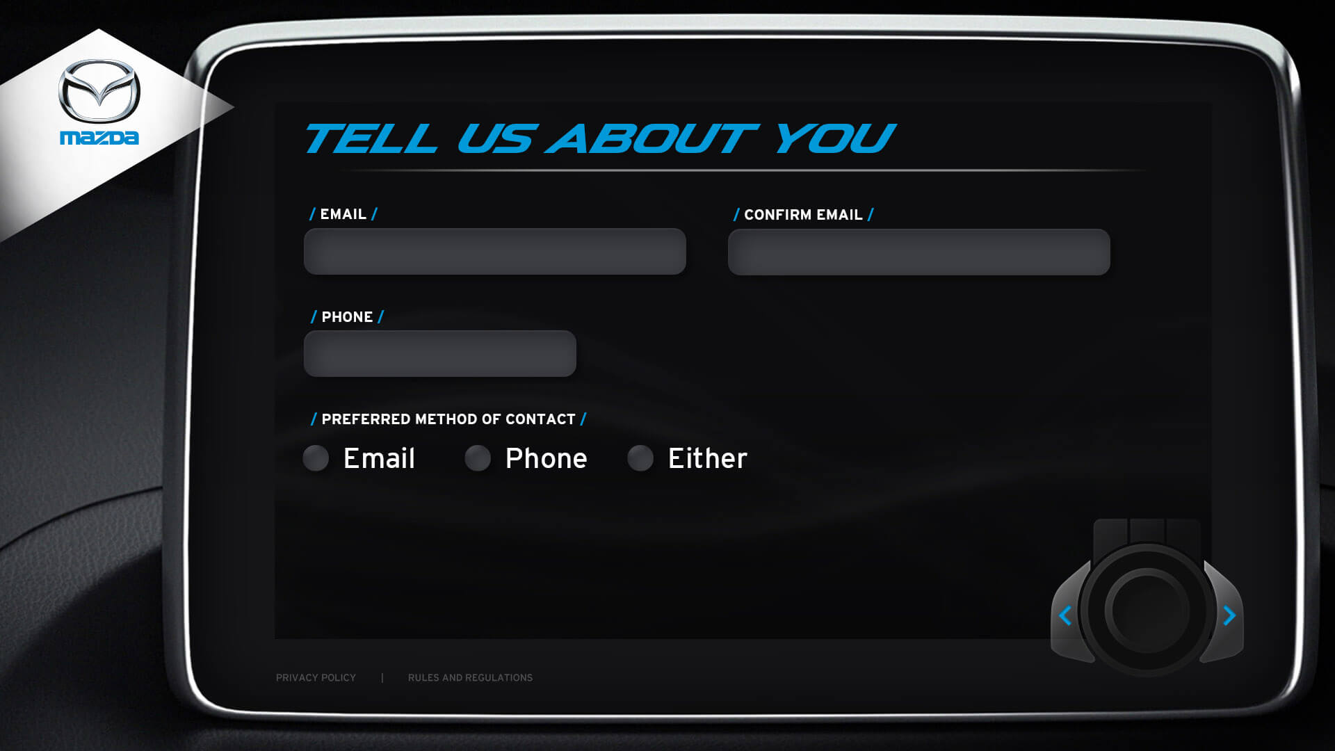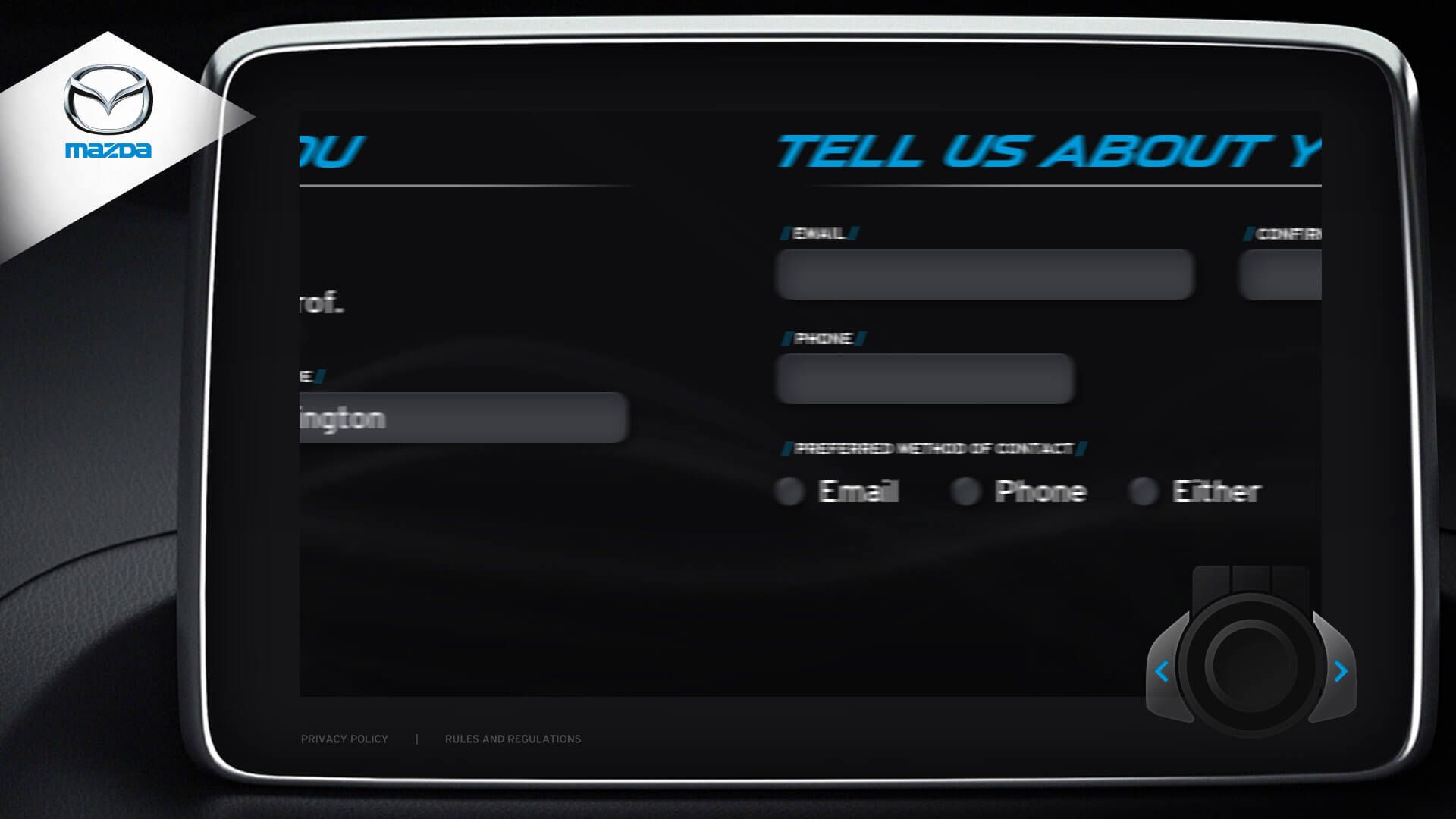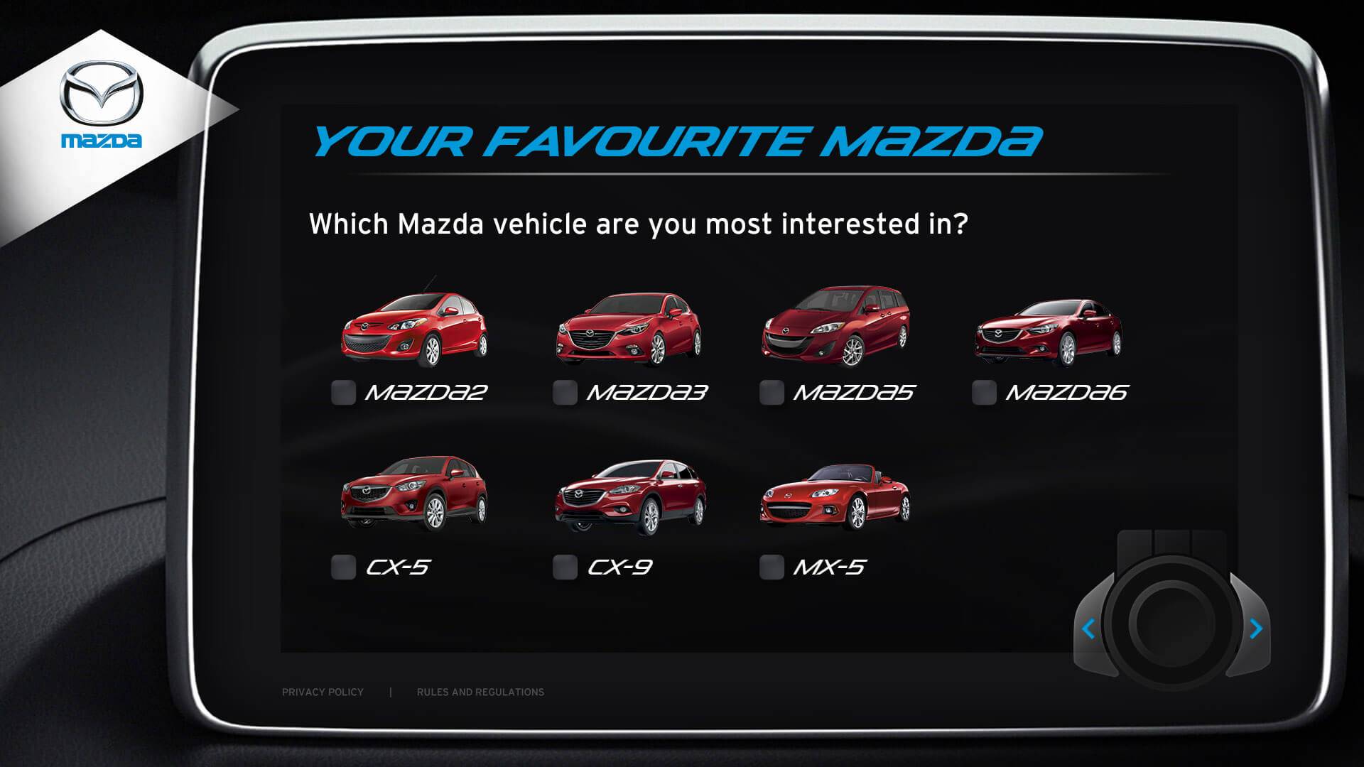 The vehicle lineup from Mazda is a pretty incredible selection of vehicles. I was honoured to design the kiosks user interface for Mazda's Auto Show. Elements from the redesigned Mazda3 cockpit were used in the design. The UI window is the same navigation interface from the Mazda3. The design for navigation controls (bottom right) was inspired by Mazda’s HMI Commander Switch – which resides in the center console of the Mazda3. Every possible screen was designed, which helped speed up development.