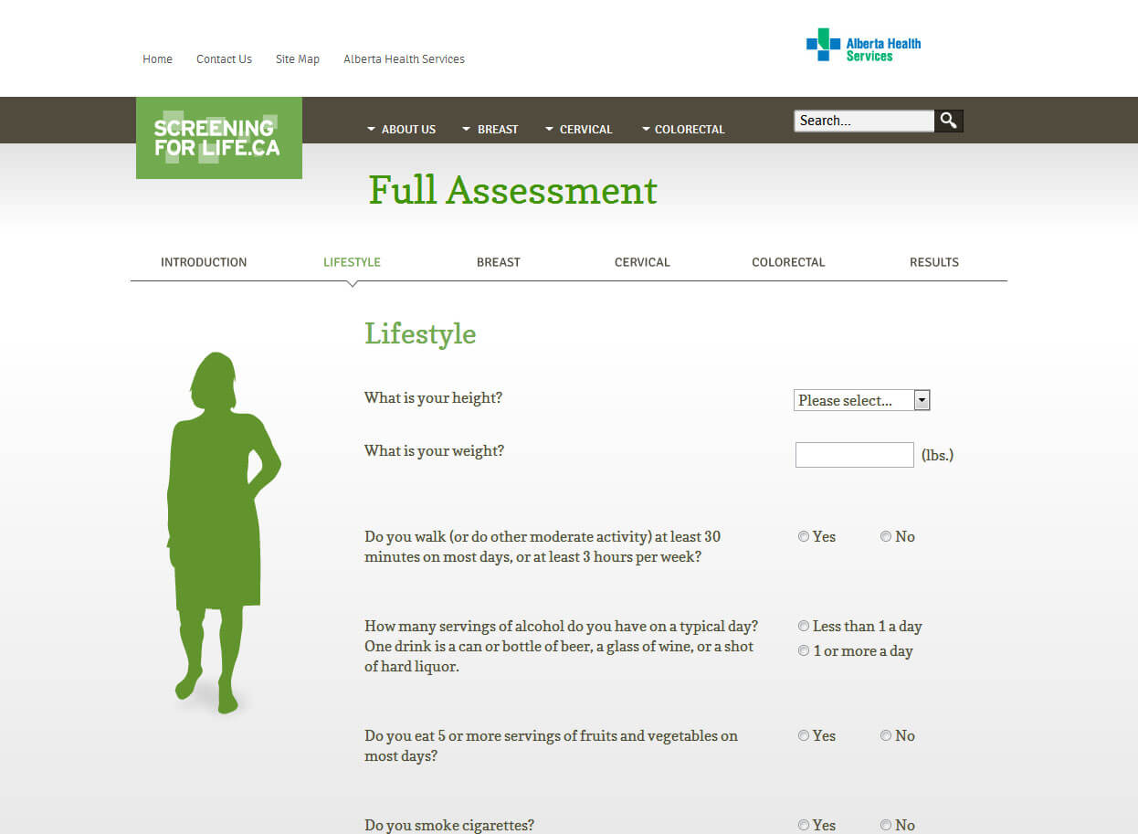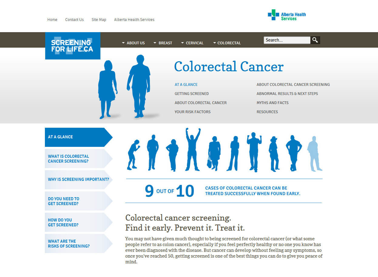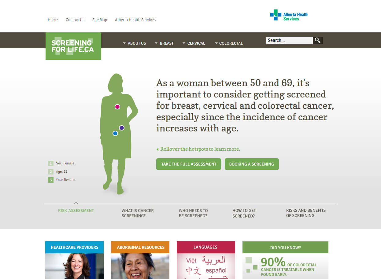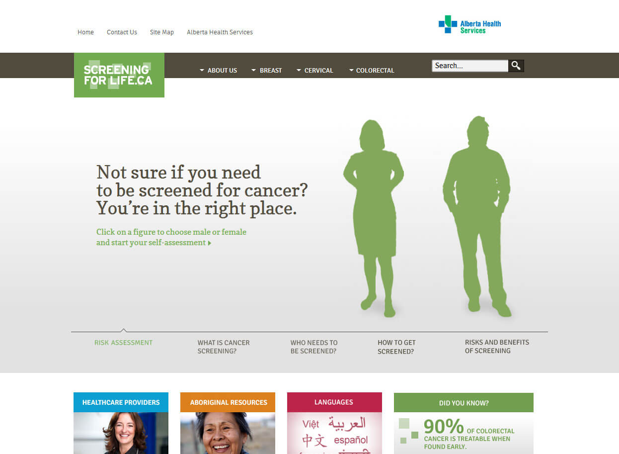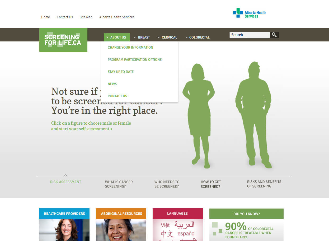 The new Screening For Life website provides information, education and support options for visitors. Cancer screening is important for us all. The Screening For Life site includes a fun way for visitors to take a full self-assessment test to see what risk factors they have and what they can do about them.
