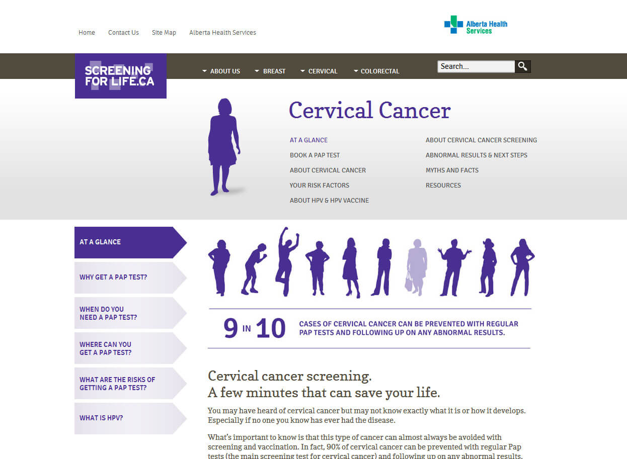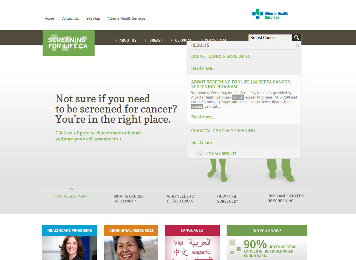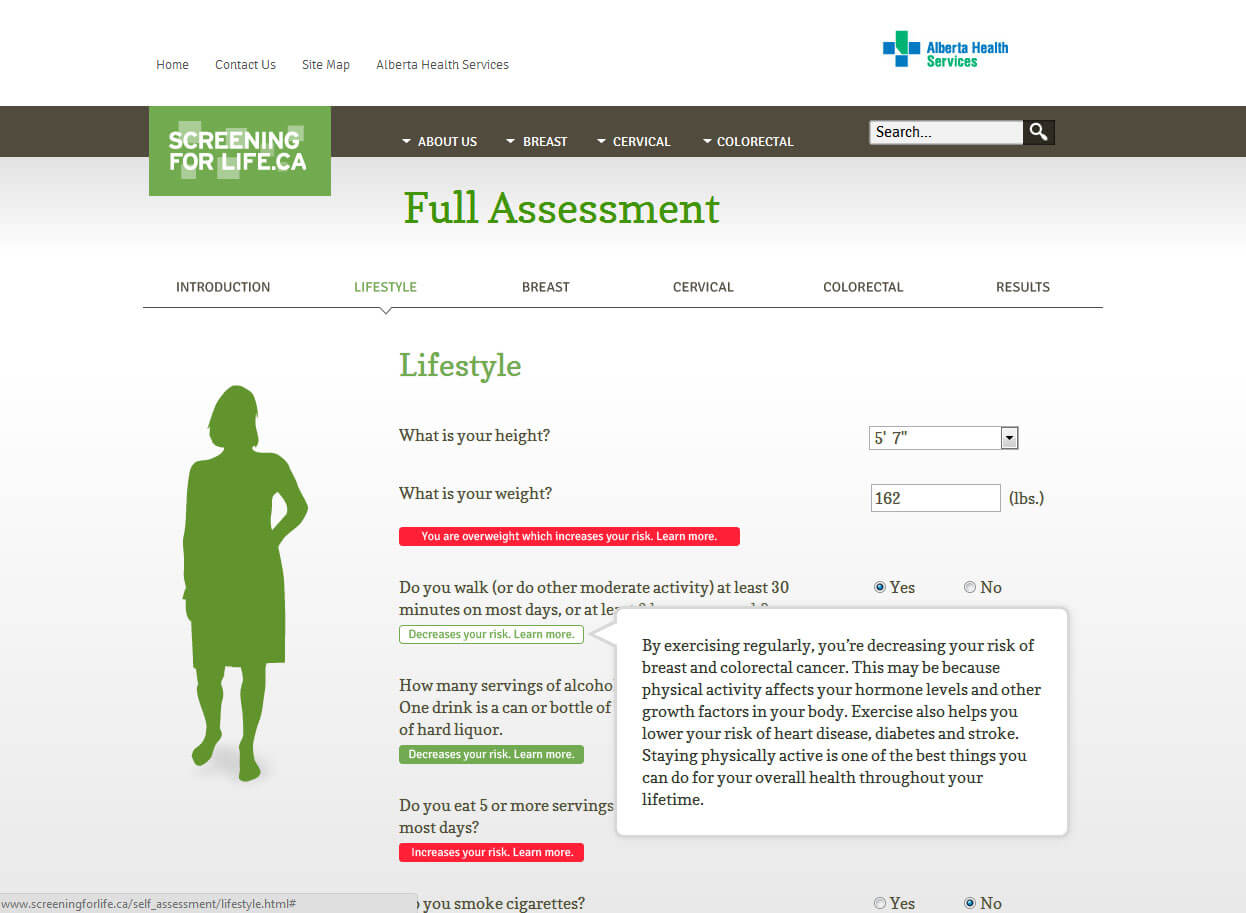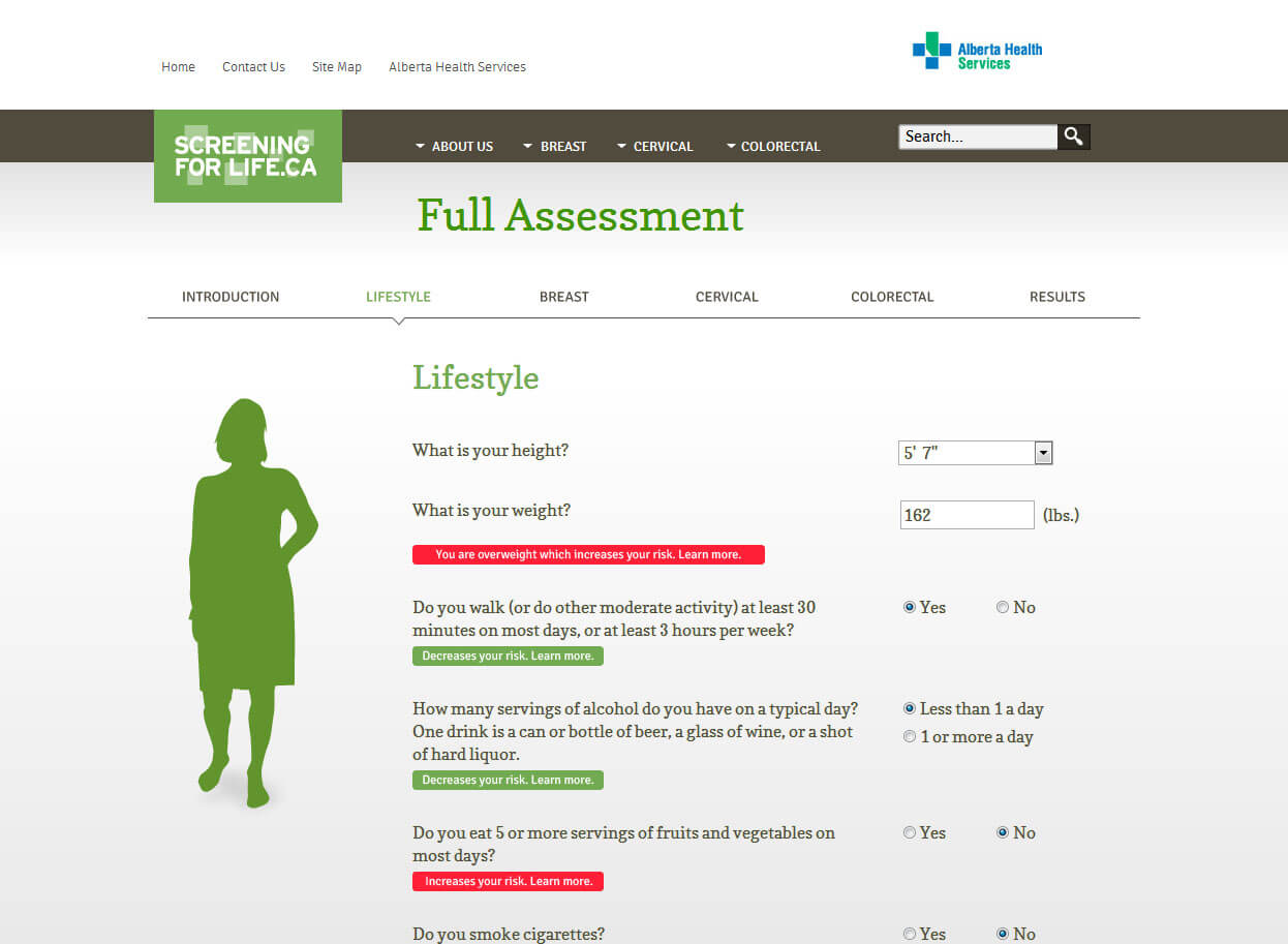 The new Screening For Life website provides information, education and support options for visitors. Cancer screening is important for us all. The Screening For Life site includes a fun way for visitors to take a full self-assessment test to see what risk factors they have and what they can do about them.