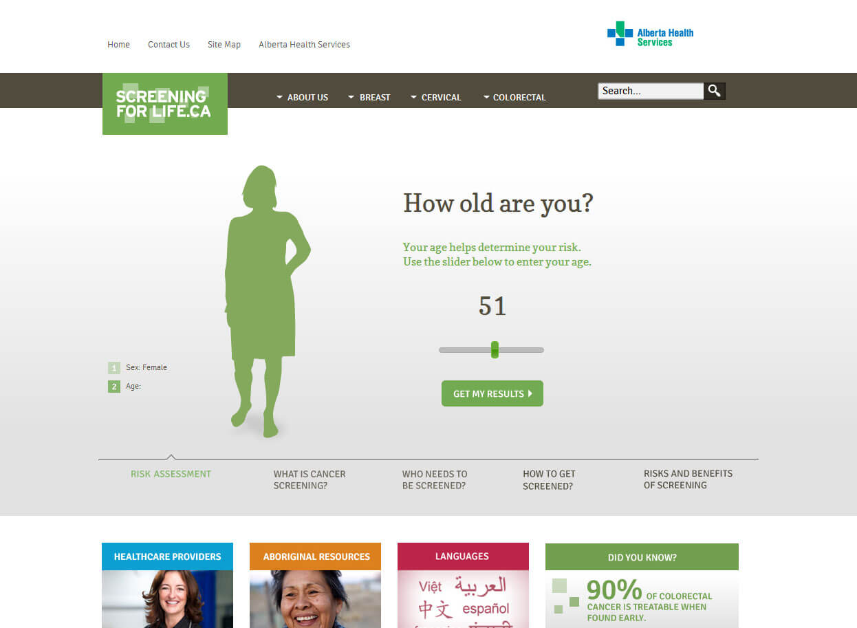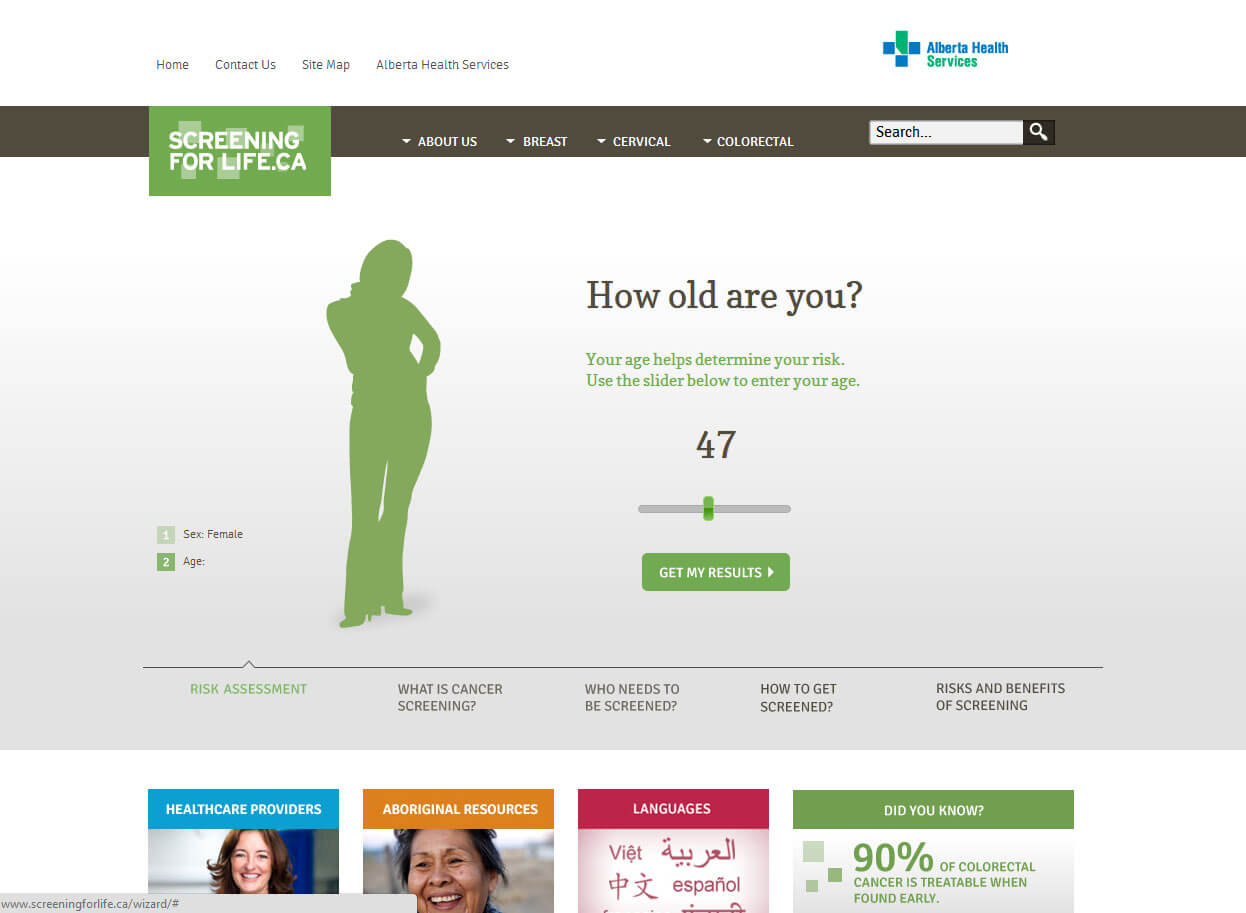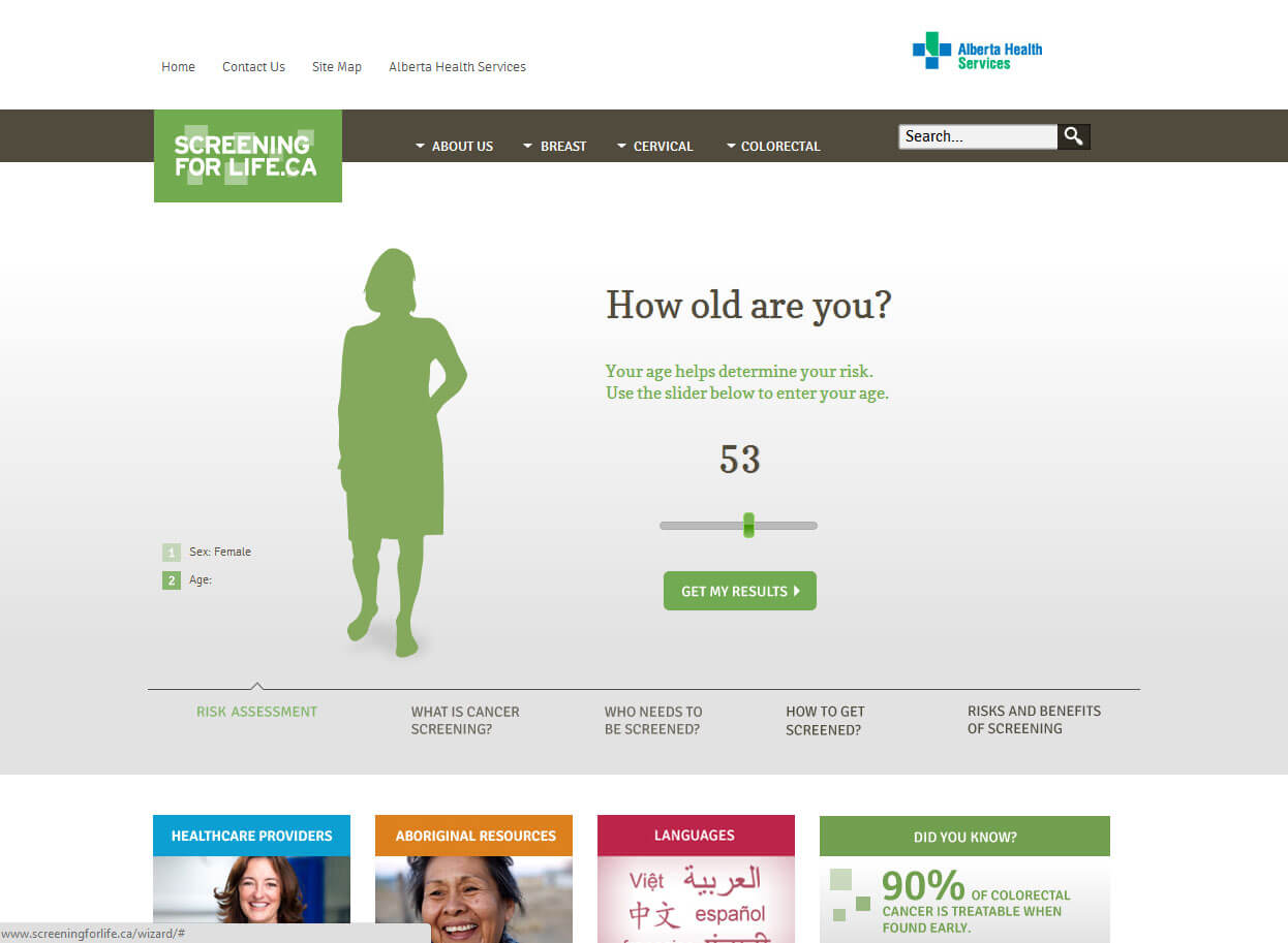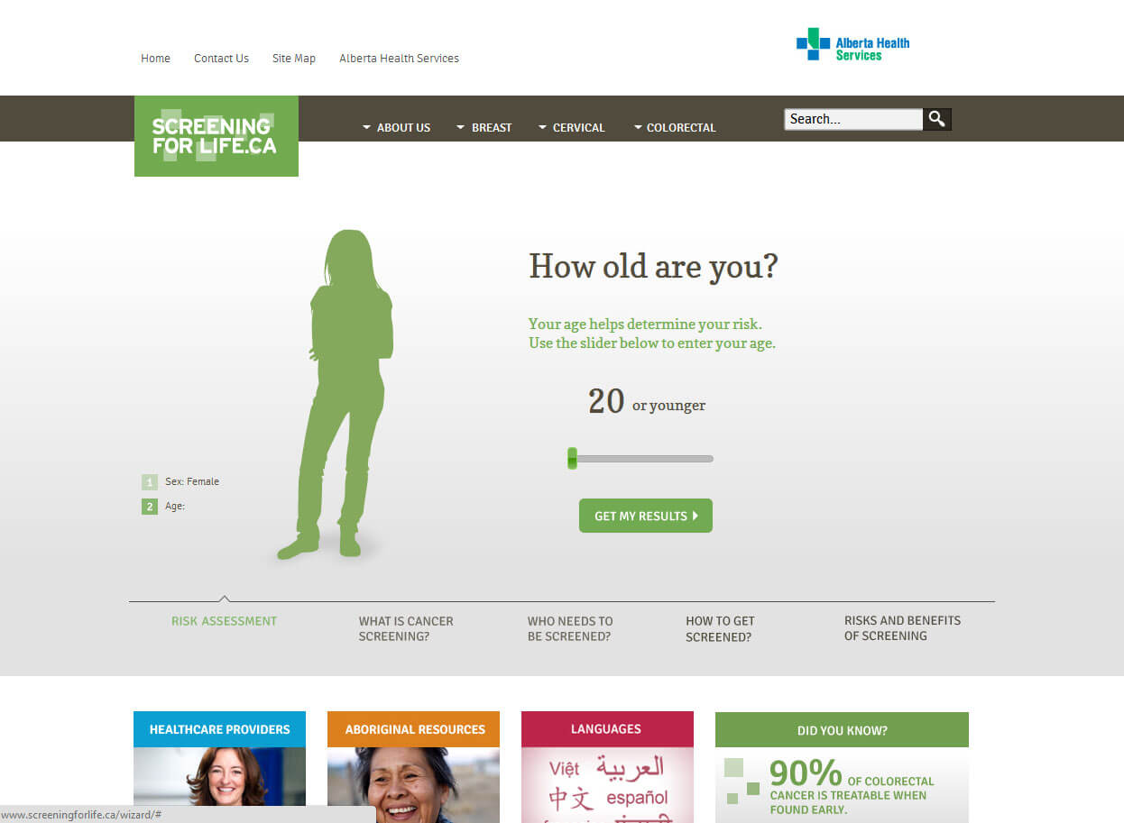 The home page includes a fun way to get some targeted information about cancer screening (based on your gender and age). Select the male or female silhouette and select your age - using the age slider. The age slider will transform the silhouette and display different information - based on selected age.
