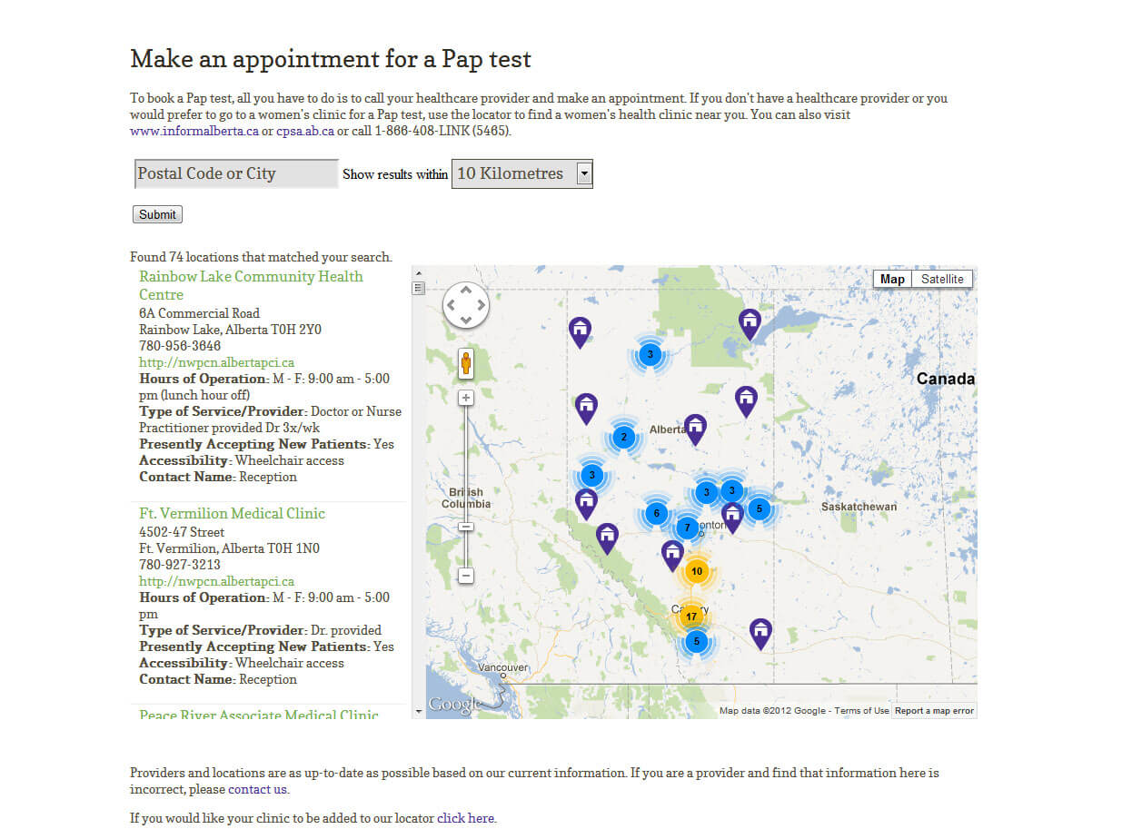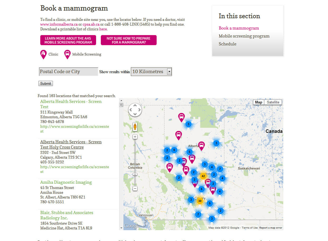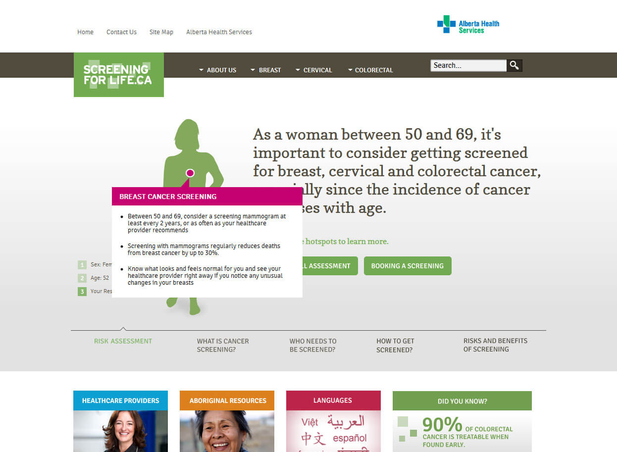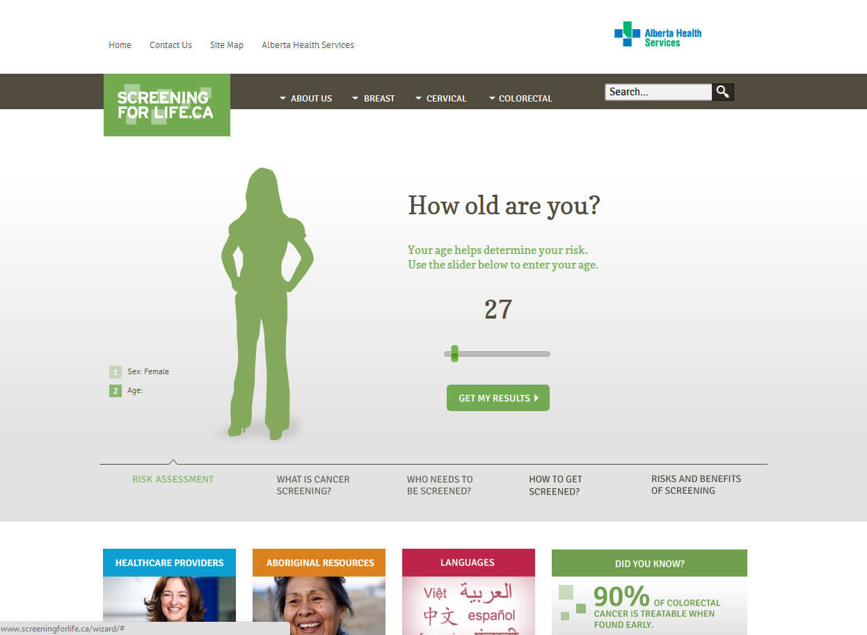 The home page includes a fun way to get some targeted information about cancer screening (based on your gender and age). Select the male or female silhouette and select your age - using the age slider. The age slider will transform the silhouette and display different information - based on selected age.