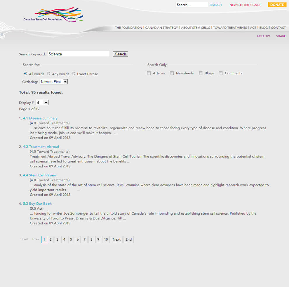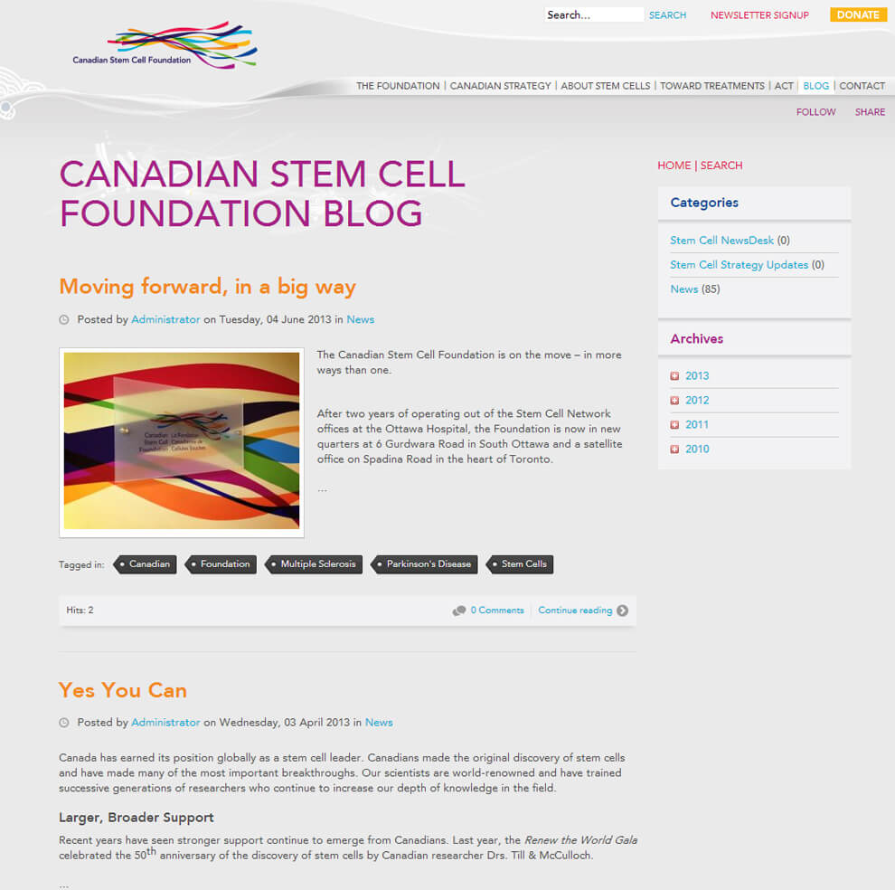 Their previous website was Flash based. Although it won many awards, they found it difficult to maintain and to update. However, the new Canadian Stem Cell Foundation website is built with the Joomla CMS. The entire website is fully managed and maintained by the client.